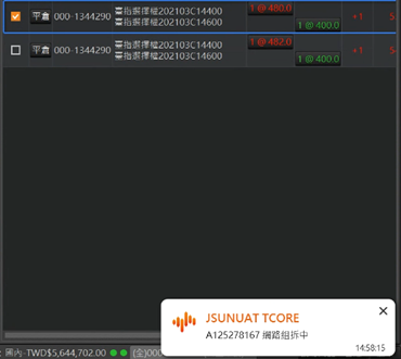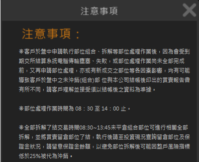 訊息跳出訊息提示❋客戶於盤中申請執行部位組合、拆解等部位處理作業後,因為會受到期交所結算系統電腦傳輸壅塞、失敗,或部位處理作業尚未全部完成 前,又再申請部位處理,亦或有新成交之部位等各因素影響,均有可能導致客戶於盤中之未沖銷(組合)部 位與本公司結帳後印出的買賣報告書有所不同,請客戶理解並接受須以結帳後之資料為準據。