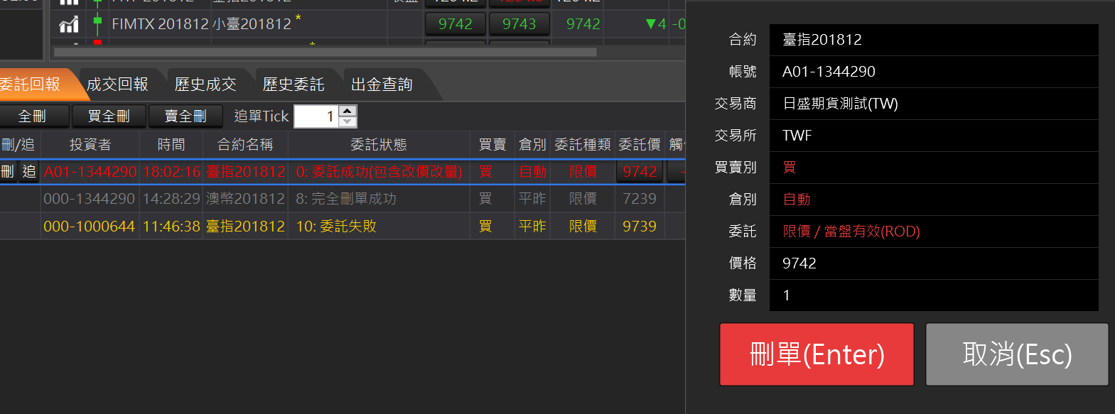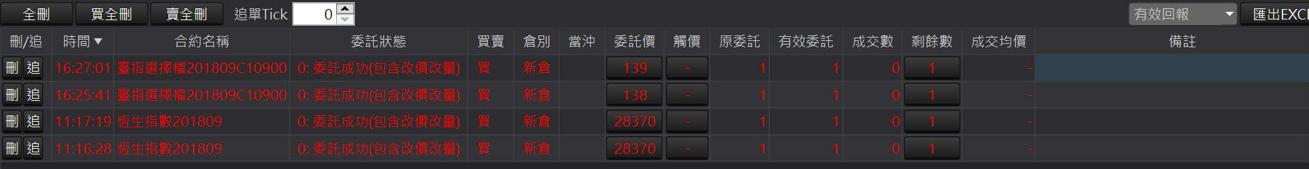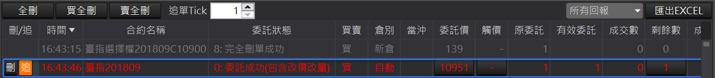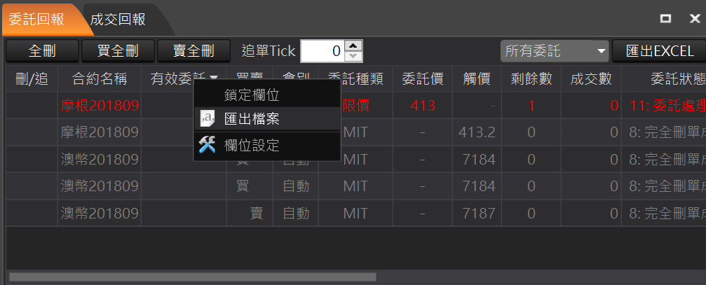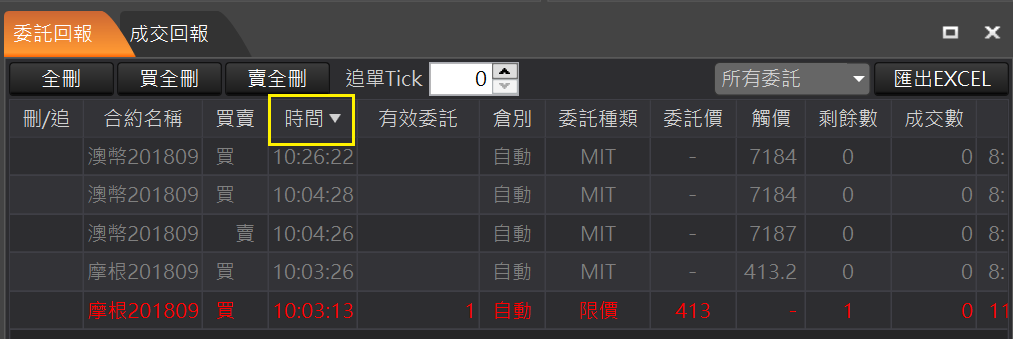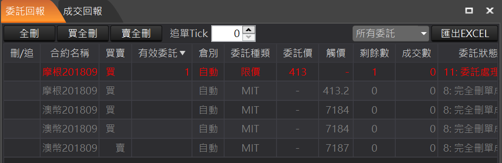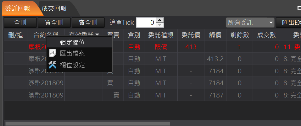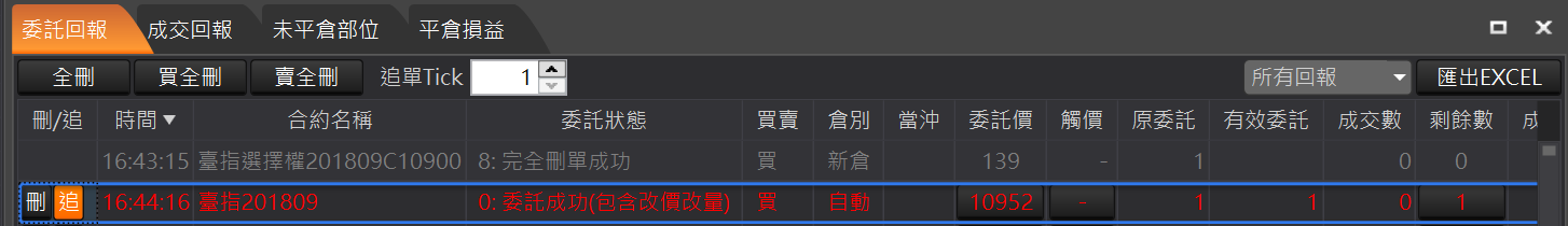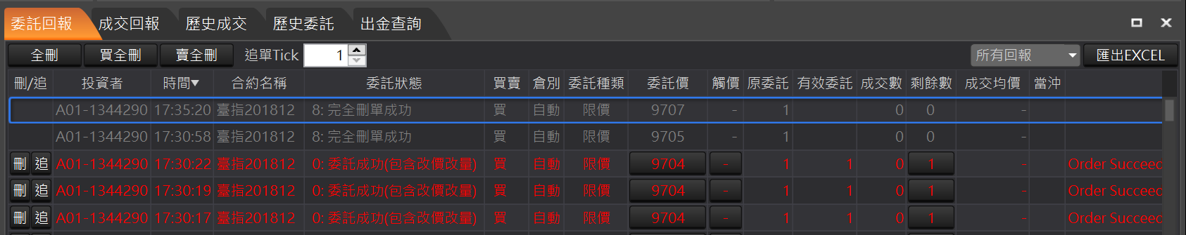 全刪:回報左上角的「全刪」按鈕,按確定後可以一次刪除所有未成交回報