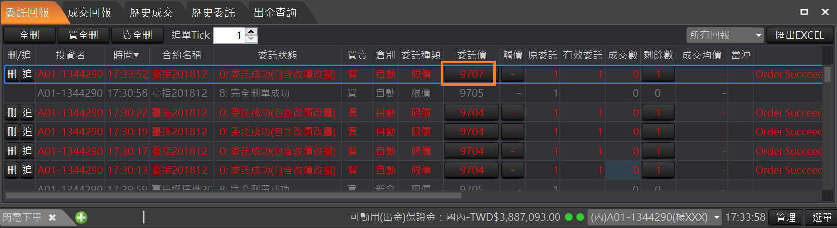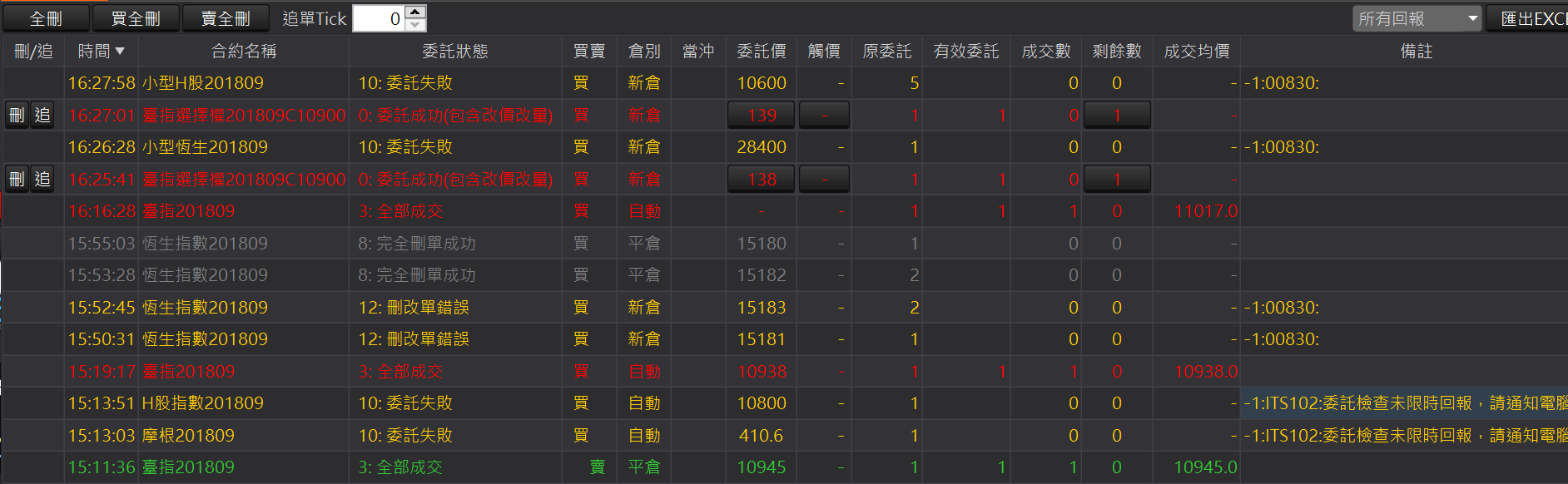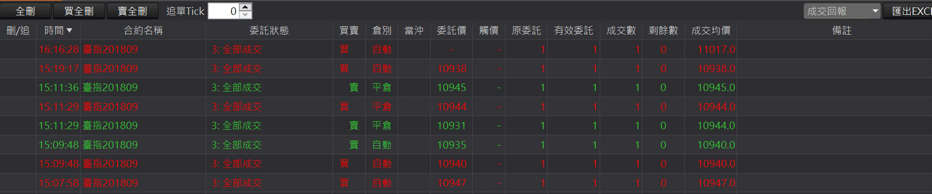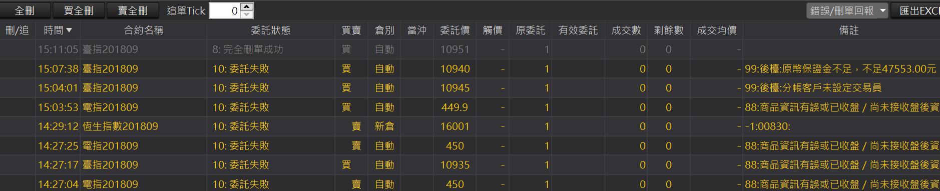 全刪:回報左上角的「全刪」按鈕,按確定後可以一次刪除所有未成交回報