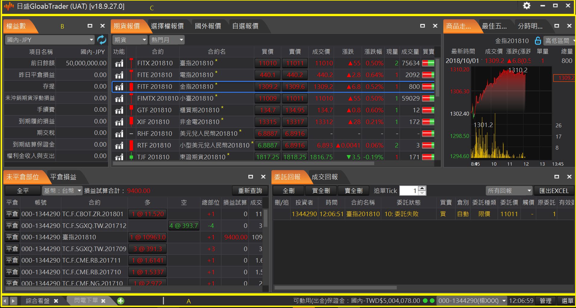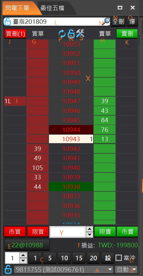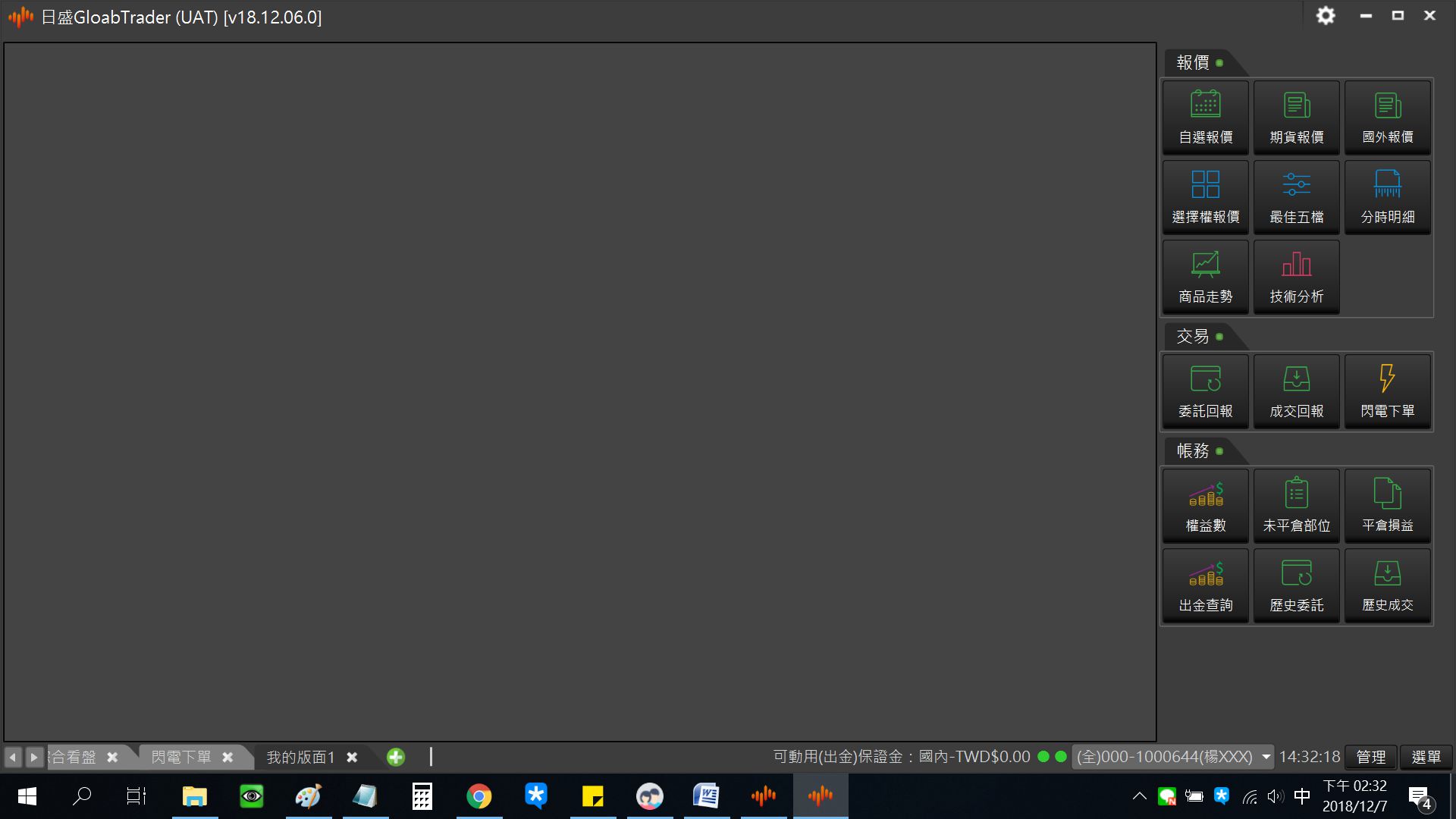 主視窗區:B區,提供報價、下單、回報、帳務等資訊。