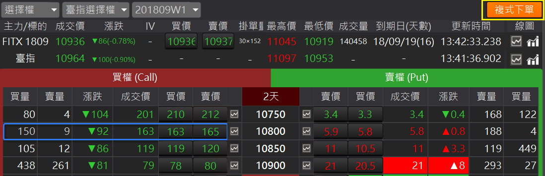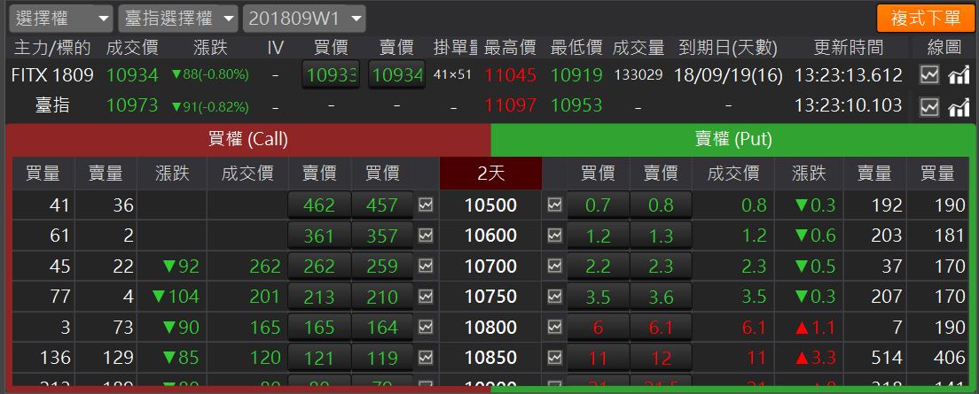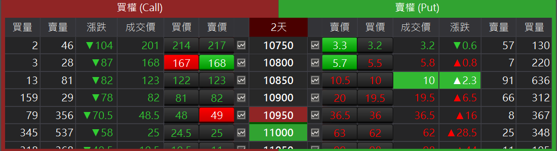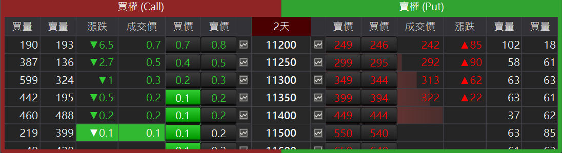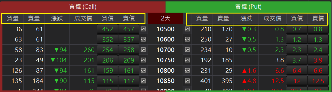 選擇權 T 型報價:讓複雜繁多的選擇權商品清晰簡單的顯示,將選擇權「履約價」 列於中間展開後,再將「買權(Call)」與「賣權(Put)」分列於左右兩側。