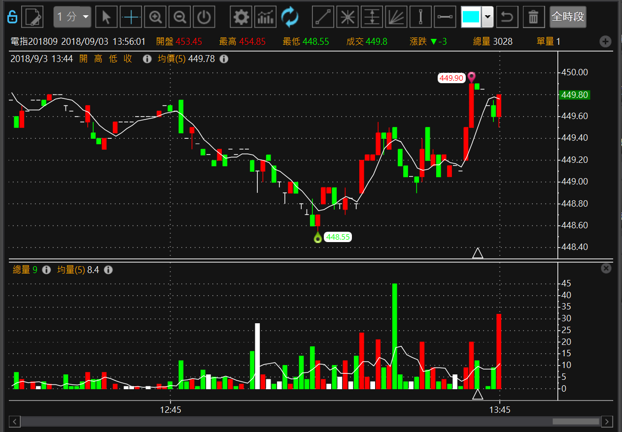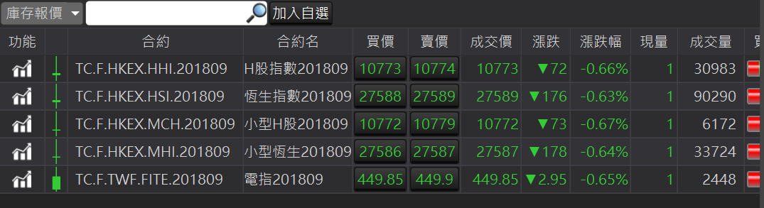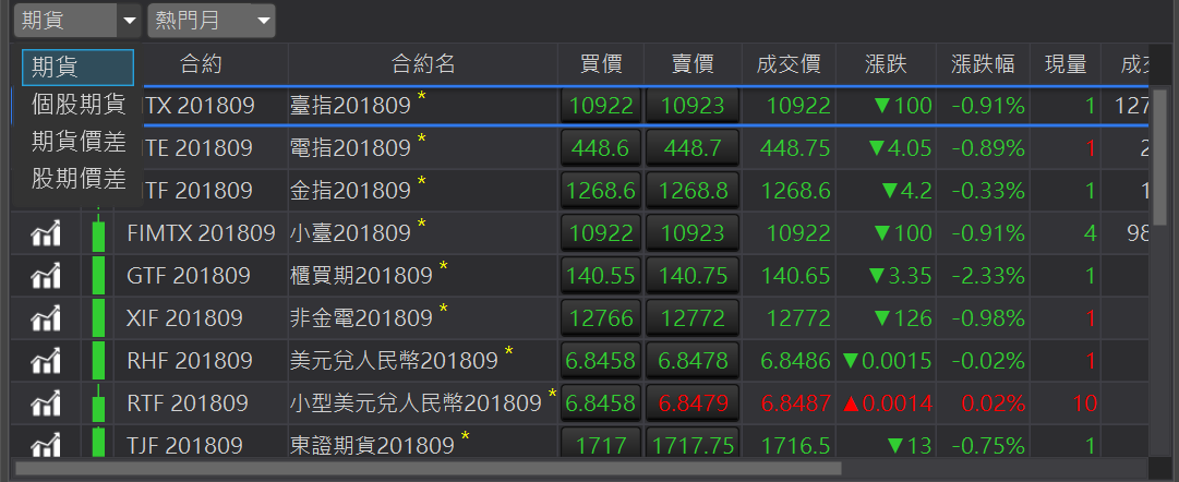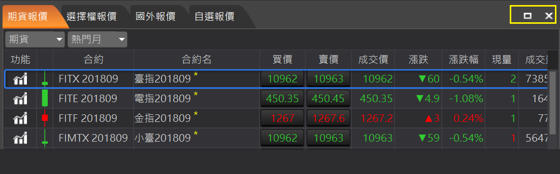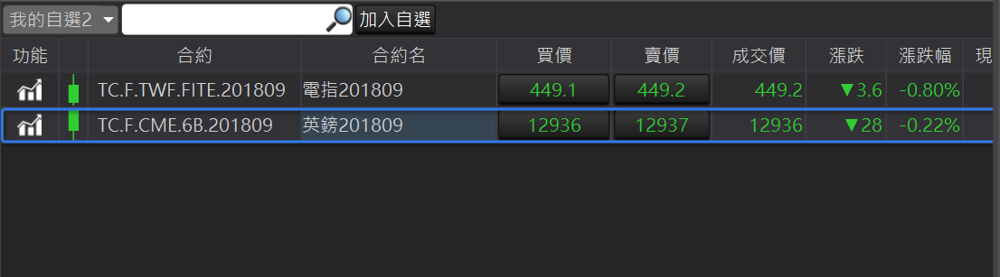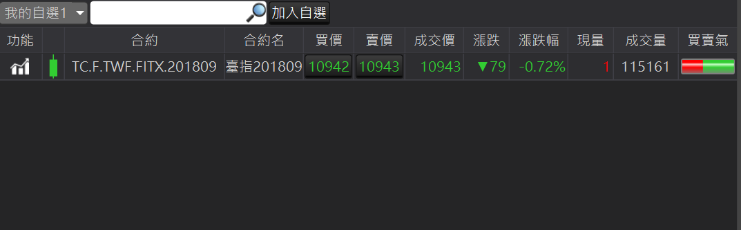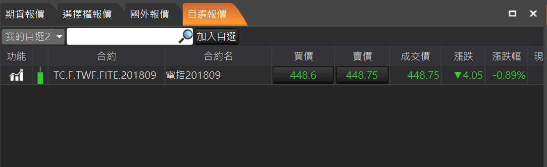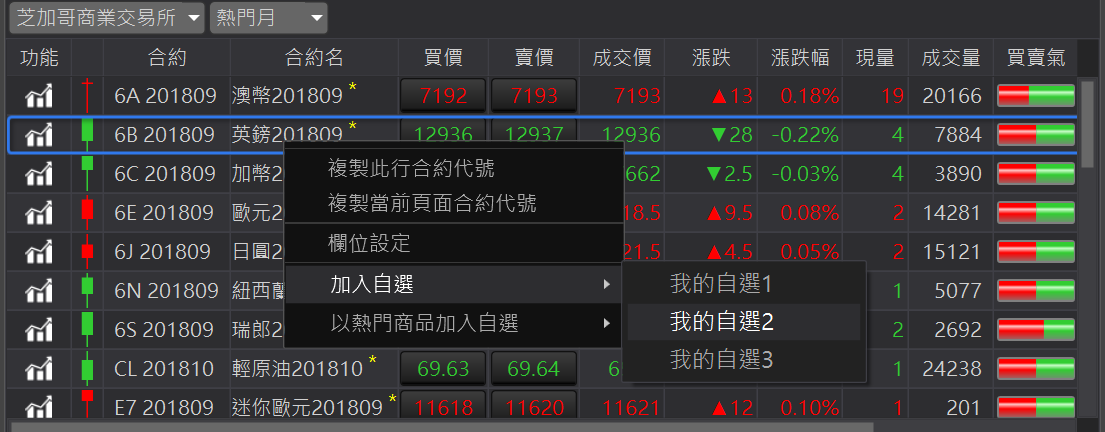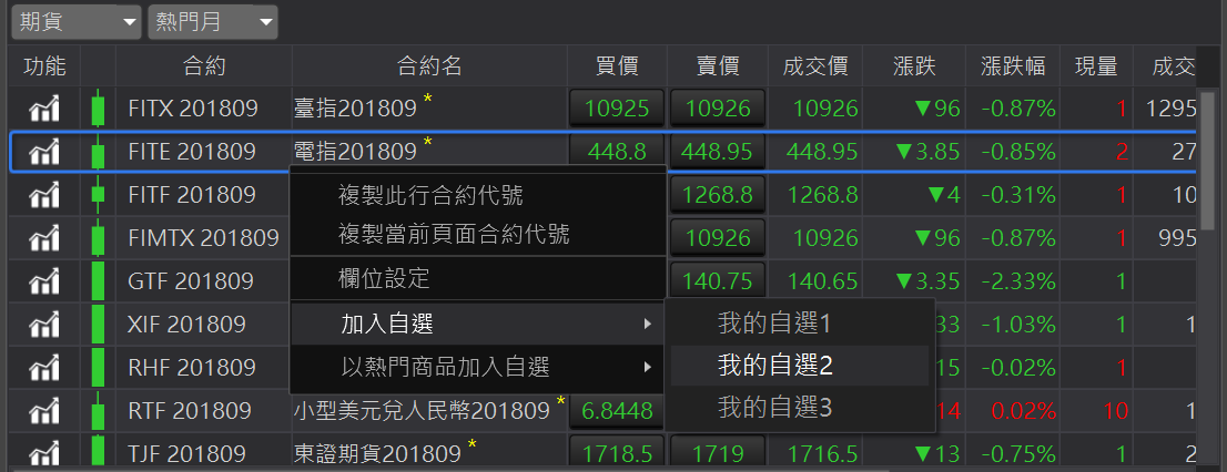 可以呼叫此合約的獨立技術分析元件。加入自選:在合約商品按滑鼠右鍵,顯示加入自選。提供三個自選供使用者使用。