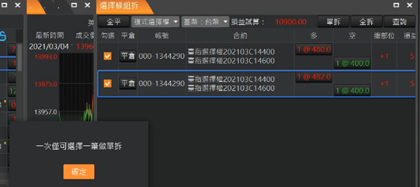 按確定顯示組拆中訊息,組拆完成會回覆組拆成功,並自動查詢未平倉單式單