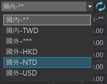 顯示幣別:使用者可選擇以 TWD、USD、人民幣為基幣轉換損益試算的幣別。