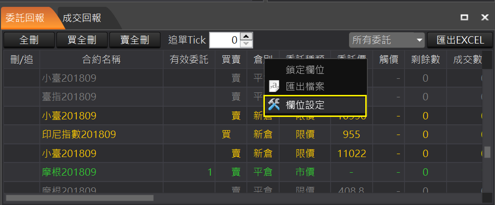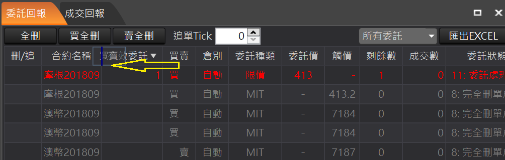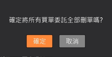 買全刪:回報左上角的「買全刪」按鈕,按確定後一次刪除所有買單的未成交回報。