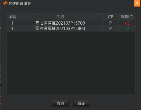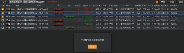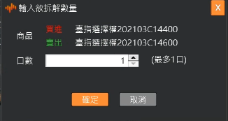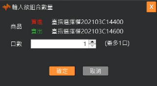 跳出彈出視窗顯示勾選的商品及數量;選擇數量後按確定進行單組。其中單組時的數量上限為兩筆明細中最小的未平倉量。