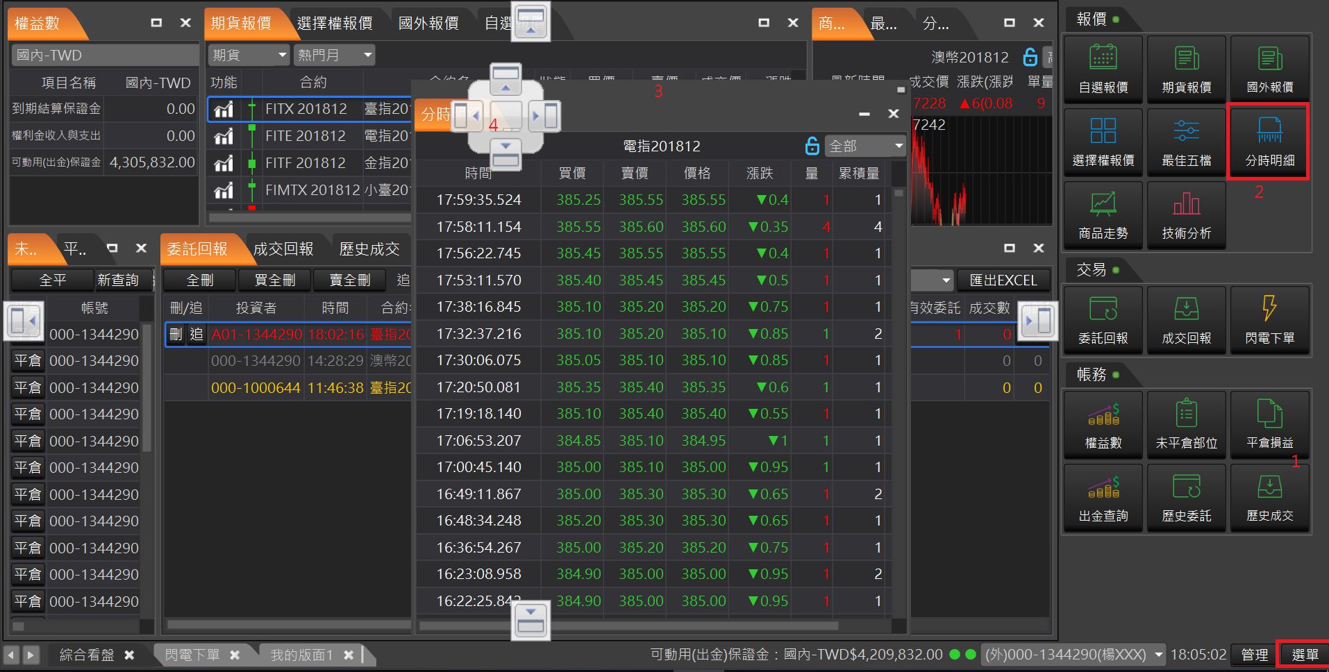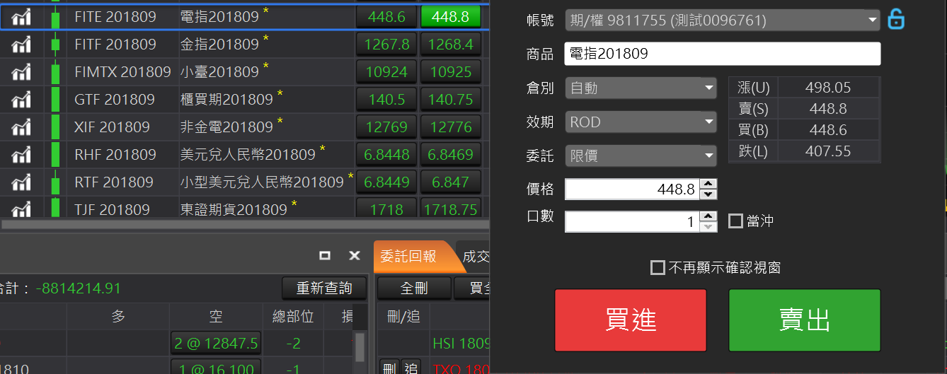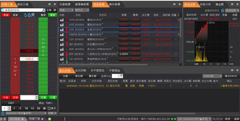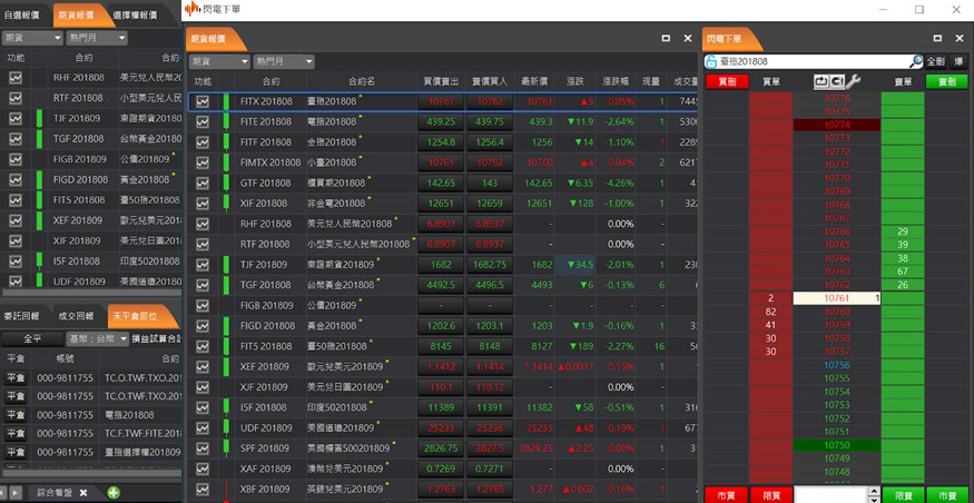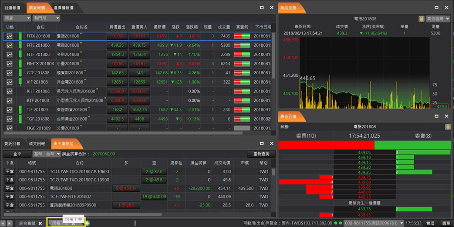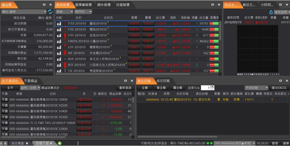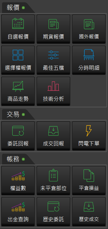 針對一般以「報價」看盤搭配「走勢分析」使用者設計的交易 版面,報價資訊最全面,包含國內外期貨報價和選擇權報價,帳務與回報資訊整合最完整。