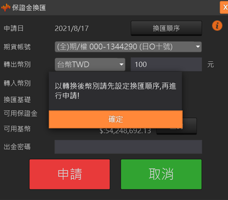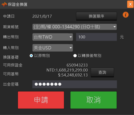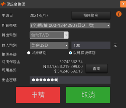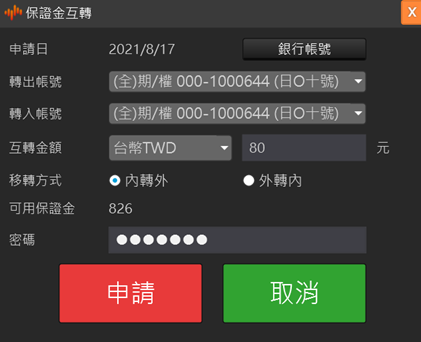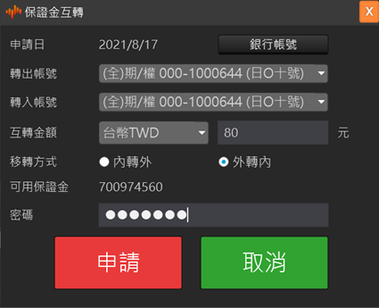 保證金互轉 選擇欲轉出的帳號和轉入的帳號,再選擇互轉的幣別和輸入互轉金額,以及移轉方式(國內轉國外或國外轉國內)。輸入出金密碼按送出申請後,即完成保證金互轉作業。
