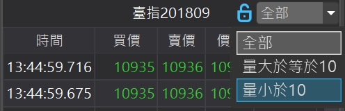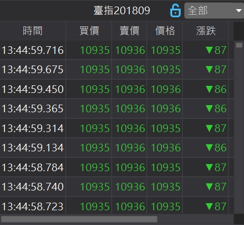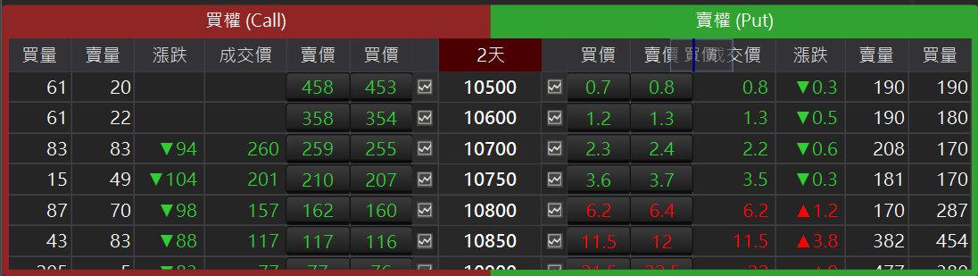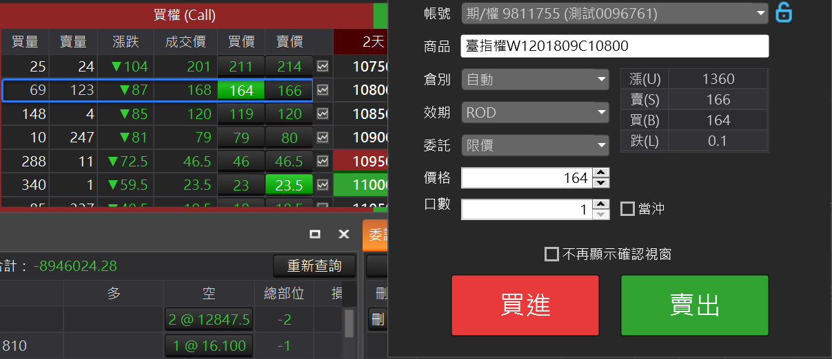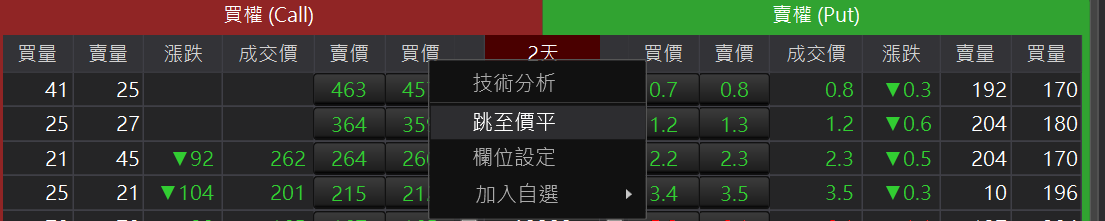 可以呼叫此合約的走勢元件。回到目前平值價位:在欄位按滑鼠右鍵,點選跳至價平回到目前成交價
