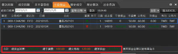 為T+1日,當您欲查詢夜盤商品的狀況,結束日期顯示使用者平倉損益資訊。包含總損益/總手續費/總交易稅/總淨損益,並可分內外期商品做篩選。
