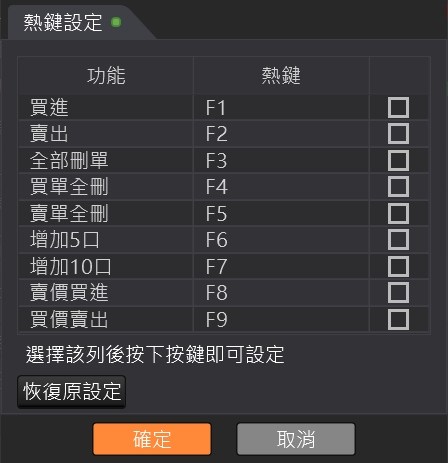 支援版面匯入、版面匯出,回復預設版面、呼叫快捷智慧下單功能。