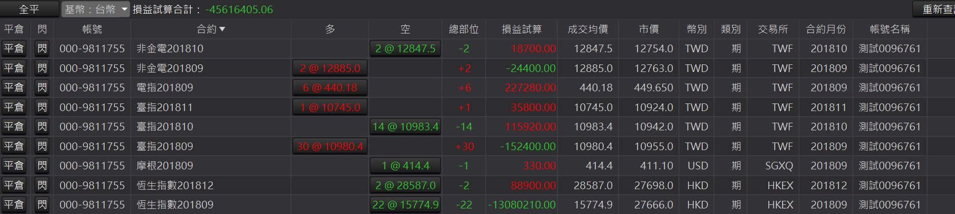 全平:點擊「全平」按鈕,可將該交易帳號下所有的未平倉部位以市價全部平倉。