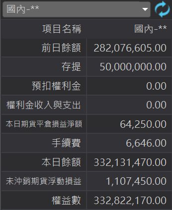 使用者可從權益數中查看各幣別的可動用保證金、前日餘額、存提等相關權益數資訊。