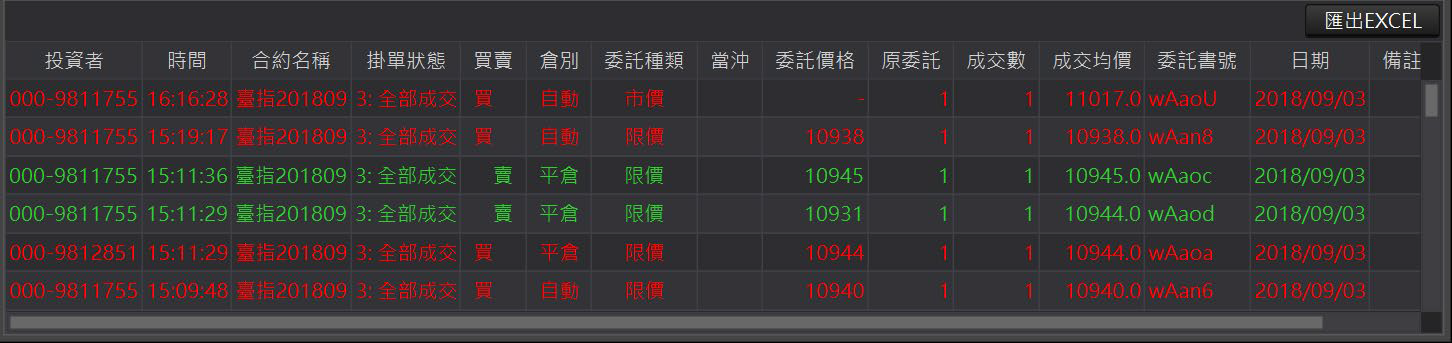 成交回報:提供使用者檢視當日已成交的回報資訊。