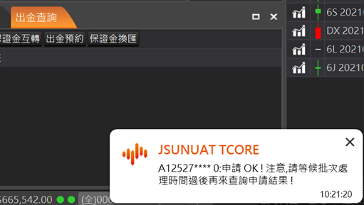 先選擇右上角欲出金的帳號,點選預約出金按鈕。選擇完成系統會自動帶出此帳號可以出金的幣別和可出金保證金,輸入欲出金金額和出金密碼按送出申請後,即完成預約出金作業。如尚未到預約時段也會出現提示訊息如圖。