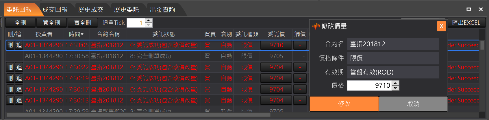 改價:提供使用者更改未成交的委託單價格,點擊未成交回報的「回報價格」欄位,系統會跳出修改價量視窗,使用者可在改設價格欄位中,輸入欲修改價格。