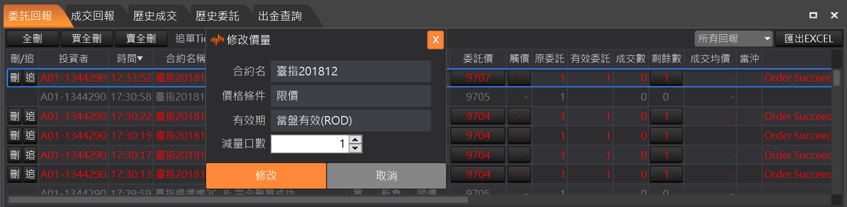 改量:提供使用者更改未成交的委託單口數。點擊未成交回報中的「剩餘數」欄位,系統會跳出修改價量視窗,使用者可在口數欄位中,輸入欲減量口數。