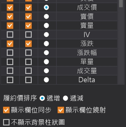 欄位設定:包含設定顯示欄位、履約價排序、顯示欄位同步、選擇權欄位是否鏡射、是否顯示背景柱狀圖、數值更新顏色閃爍