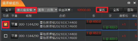 選擇權組拆功能包含單組、全組、單拆、全拆。預設顯示單式選擇權未平倉明細。